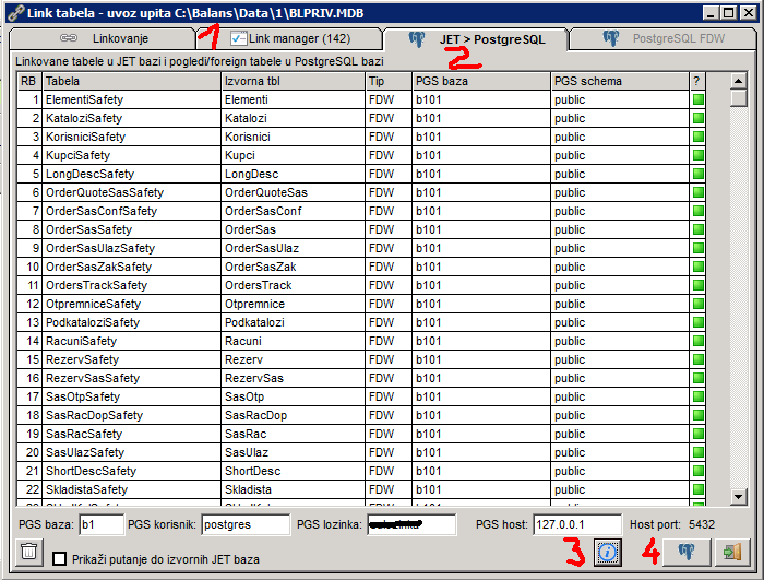 U PostgreSQL-u ne postoje linkovi u smislu JET baza (pokazivači na tabele u drugim bazama). Ako su tabele u shemama iste baze (firme) npr. prethodne godine onda im se pristupa navodjenjem imena sheme ispred imena baze npr. SELECT * FROM “2015”.Racuni tako da se umesto JET linka Racuni2015 može napraviti view Racuni2015. Ako je JET link na bazu druge firme (npr. Albo –> Boka) onda se koristi FDW (foreign data wrapper) PGS ekstenzija. Skoro ceo posao je automatizovan iz QA i potrebno je uraditi sledeće: 1. Uvesti sve baze (tekuće i prethodne godine) u PGS 2. Pokrenuti QA i spojiti se na JET bazu tekuće godine željene firme 3. Spojiti se i na PGS bazu tekuće godine željene firme 4. Otvoriti formu za linkovanje u QA 5. Kliknuti na tab “Link manager” da bi se učitali podaci o linkovima 6. Kliknuti na tab “JET > PostgreSQL” i na njemu dugme sa oznakom (i) da bi se proverilo koje “linkove” je moguće napraviti, a koje ne (zelene i crvene sličice u poslednjoj koloni grida) 7. Kliknuti na dugme sa PGS logom da bi se napravio skript za linkovanje koji treba odraditi iz pgAdmin aplikacije nad tekućom godinom (public shema) željene firme