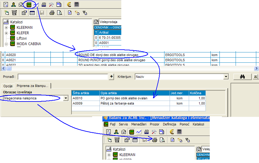 Menadžer Kataloga (artikala) ima zgodnu opciju pomoću koje se mogu odabrati artikli u određenoj količini i ceni i odštampati na unapred prilagođenim obrascima. Ovako se realizuje štampa proizvoljni Magacinski Kartica (Kleemann) ili Cenovne kartice (za rafove u MP) ili bilo šta što se bazira na dostupnim podacima.