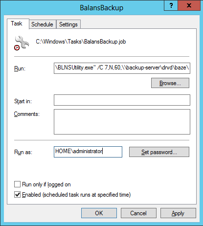 Primer u Task Scheduller-u (Run polje): “F:\Balans 20\BLNSPrograms\UTILITY\Balans Utility\BLNSUtility.exe” /C 4,N,15,G:\TMP\Bckup\,S