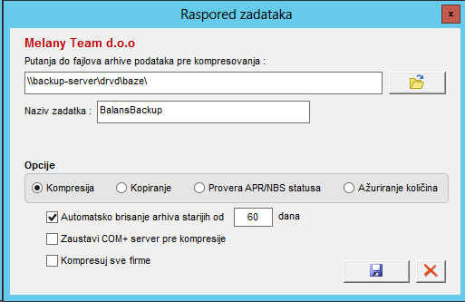 Zadatak za kompresiju i backup se može napraviti i (skoro) automatski ulaskom u Balans alate, opcija “Kompresovanje i arhiviranje”, odabere se firma pa se klikne na