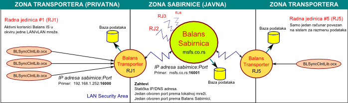 | Adresa Sabirnice | msfs.co.rs (registrovana DNS adresa); 92.45.1.252 (neregistrovana statička IP adresa); | Balans Sabirnica koristi javnu IP adresu računara na kom je instaliran za osluškivanje zahteva sa Balans Transportera izdvojenih radnih jedinica. Ova adresa mora biti statična i dostupna svim Balans Transporterima u sinhronizaciji. U slučajevima kada se ne može obezbediti statična IP adresa mogu se koristiti i raspoloživi internet servisi koji dinamički razrešavaju IP adresu servera pretvarajući je u statički dostupnu logičku adresu (myftp.org, noip itd.) | Neophodno je dozvoliti svakom Balans Transporteru radne jedinice prolazak kroz firewall i ruter ka adresi Balans Sabirnice. |